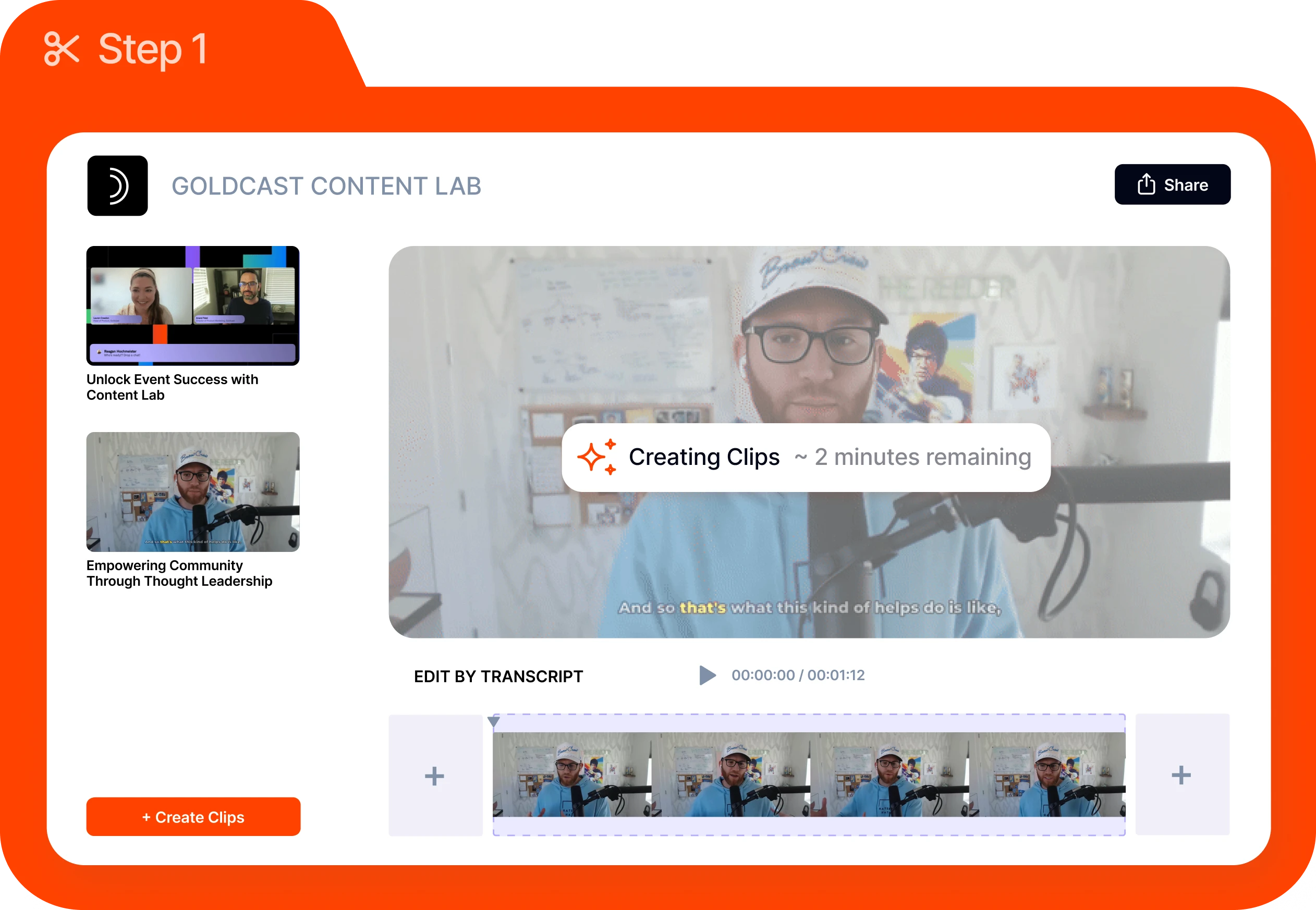 Run webinars and record videos in Goldcast. AI finds the best moments, spins out channel-ready clips, and unifies creating, editing, and distribution—end to end.