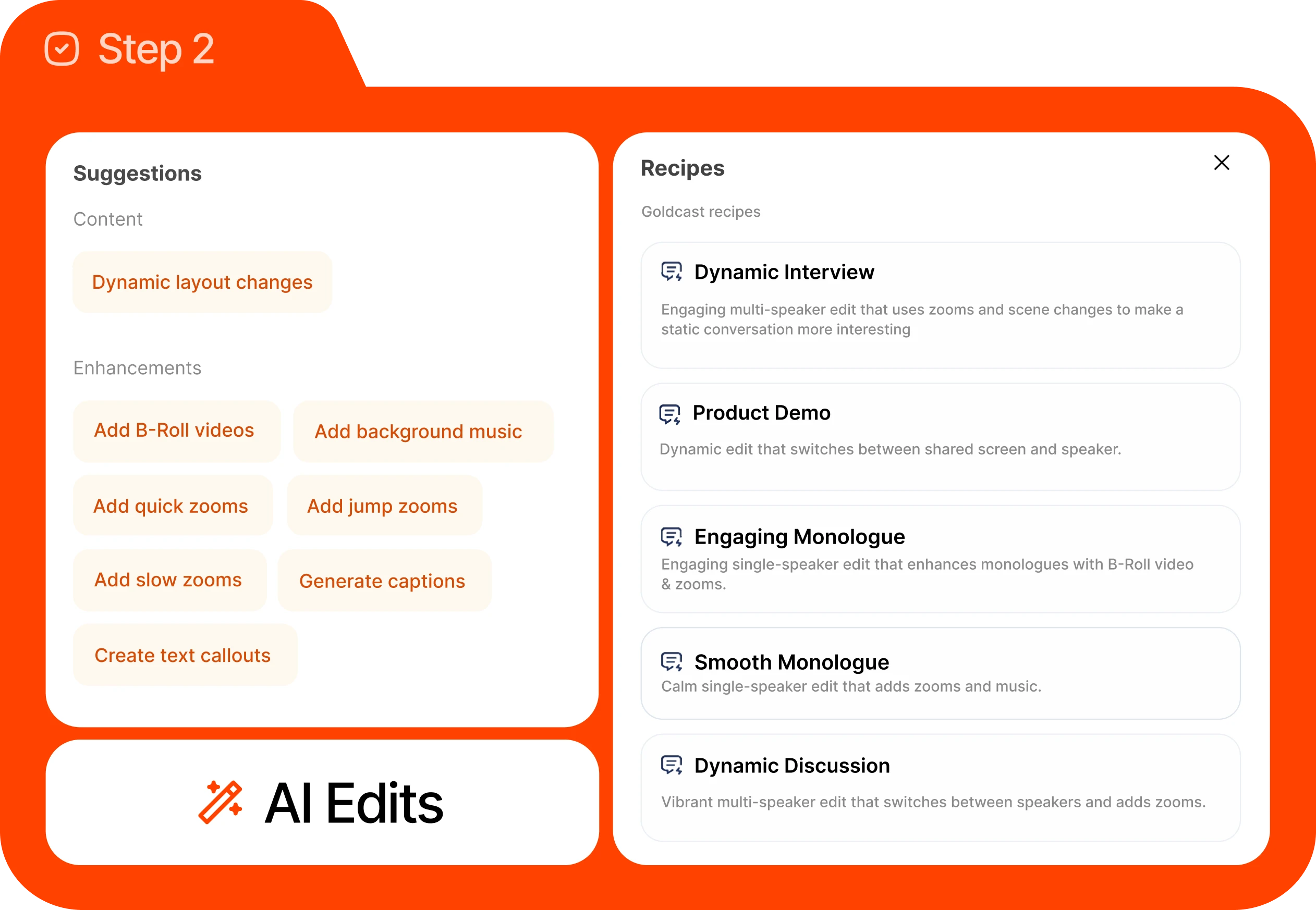 No more editor queues. No “we’ll get to it.” Goldcast AI auto-edits your zooms, scene changes, B-roll, dynamic captions turning long-form into dynamic, on-brand clips in minutes, not weeks.