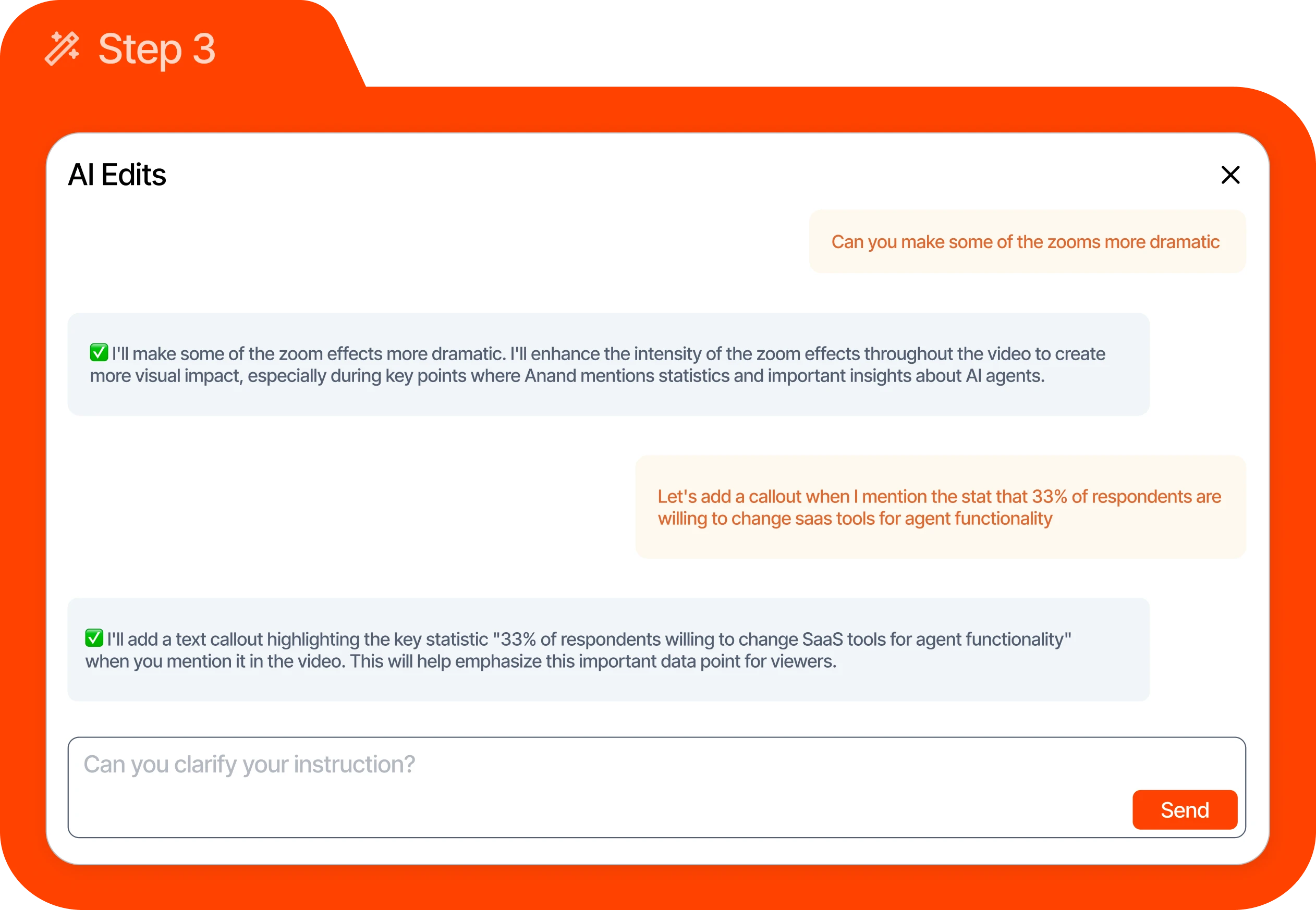 Trim filler, set zoom start/stop, swap layouts, tweak captions, add overlays and lower-thirds. Adjust or undo any AI edit—no complicated learning curve.