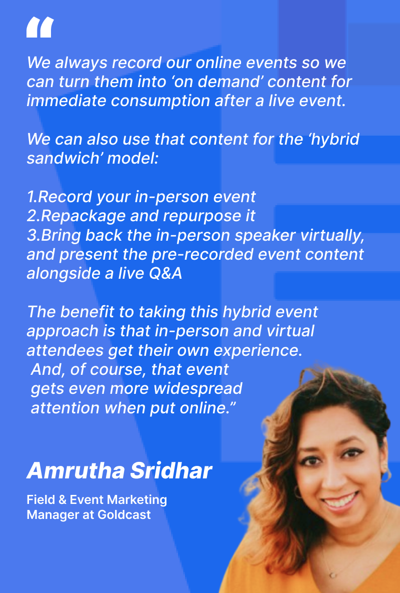 And while stand-alone events can absolutely generate ROI all by themselves, there’s no reason to stop there. Both virtual events and in-person events are a goldmine for additional content gems!