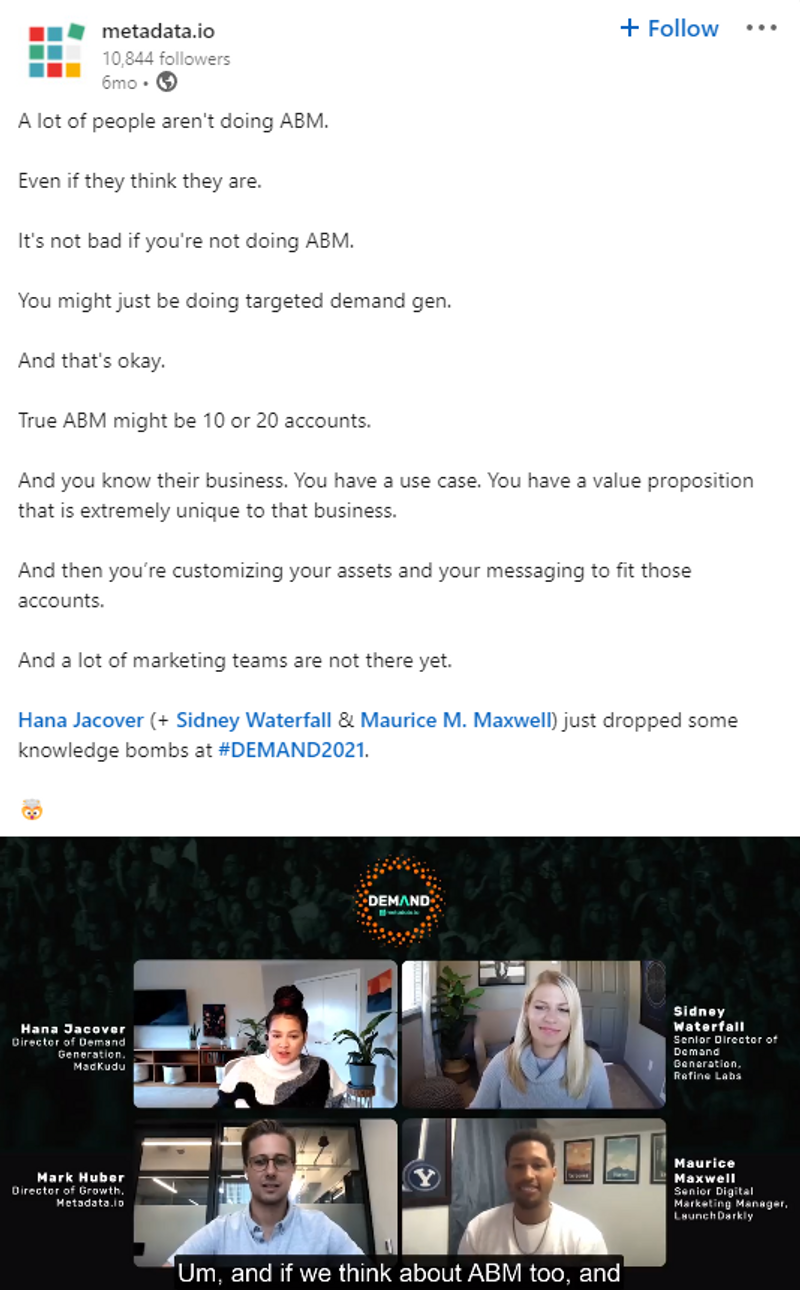 Check out how Metadata.io expertly repurposed snippets of their Demand2021 event content on LinkedIn. Sharing a commonly overlooked tip or slightly controversial opinion from your event can be a great way to capture your audience’s attention on other channels.