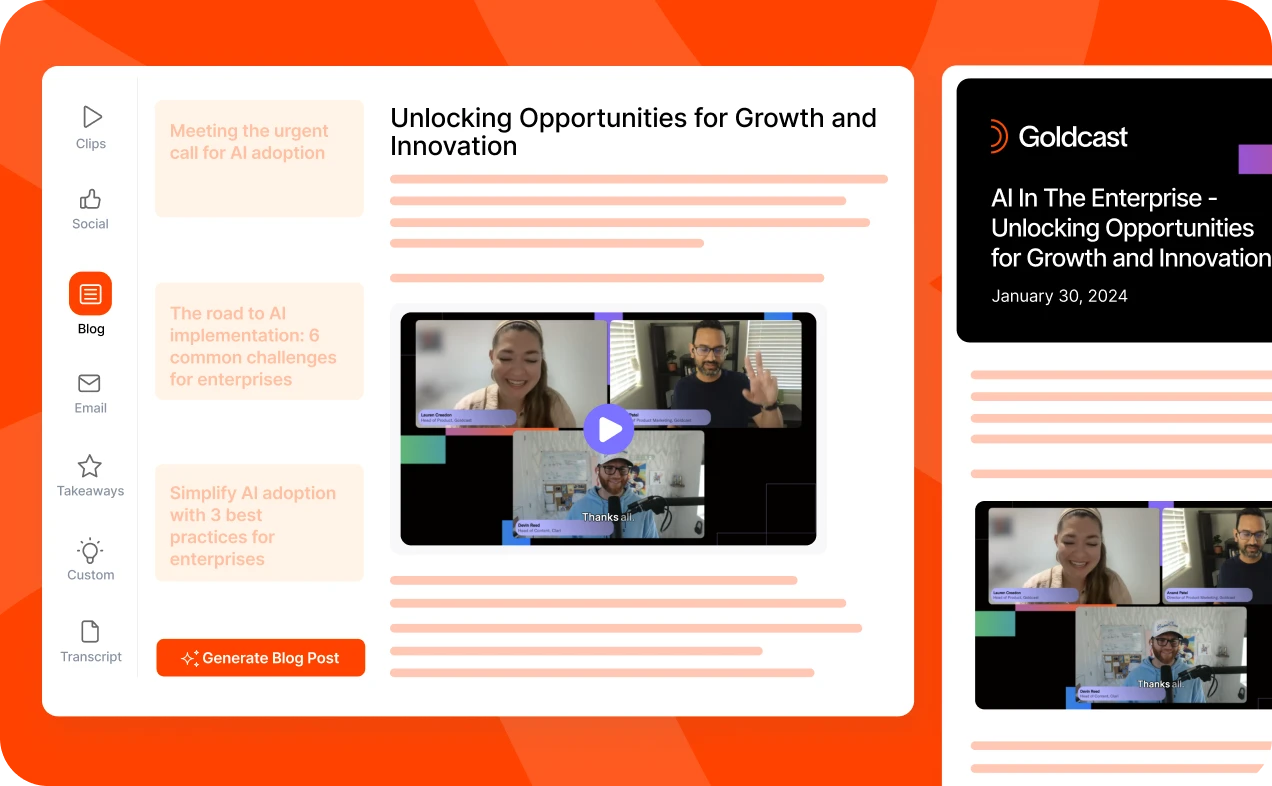 With Goldcast’s new Video GEO features, your event videos, on-demand hubs, and video hub pages are automatically updated with metadata, transcripts, and AI-generated summaries — so they're more accessible to both search engines and AI models.