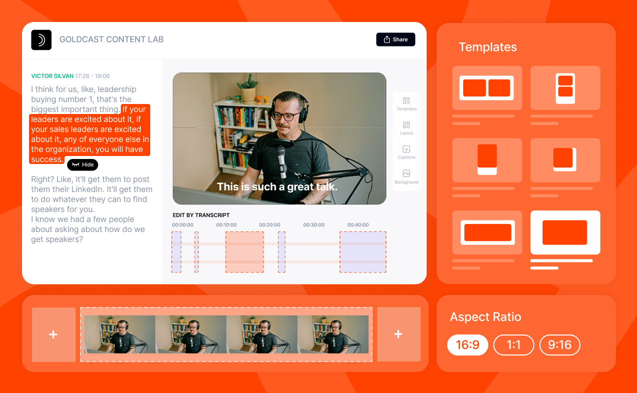 Remove filler words, long pauses, and words you don’t want and keep your brand’s look and feel consistent with templates, intro/outro sections, and image overlays.
