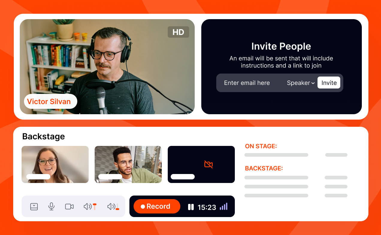 Capture all podcasts locally on your and your guest’s devices—preserving the quality of your audio and video. All while letting you customize your logos, backgrounds, and other video production tools like overlays and lower-thirds.