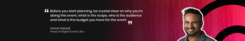 “Your event goals should be realistic and based upon your overall scope. Answering questions about your goals and audience allows you to build the scope of the event. Based on the scope you can then set realistic expectations and goals for total live registrations, live and on-demand attendees, attendance rate, # of qualified leads and new $-pipeline (for lead gen events),” explains Ashesh.