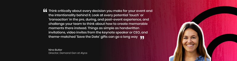 “Always start with an outcome and work your way backward from there. Sometimes marketers get so excited by a theme or event concept, as opposed to saying, ‘What business outcome am I looking to improve?’ and then determining the best type of omnichannel experience that will get your audience to take the desired behaviors that drive toward that outcome,” says Nina.