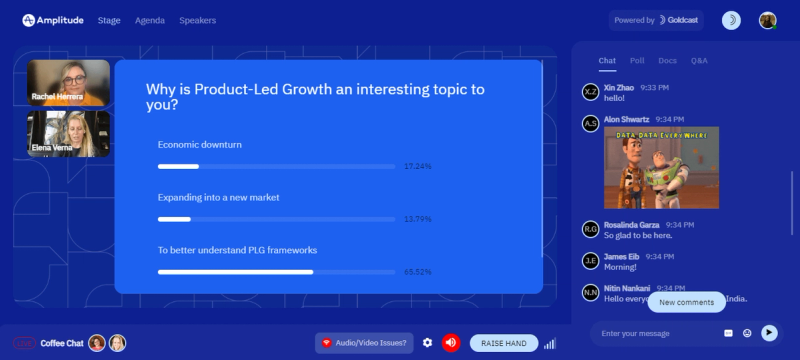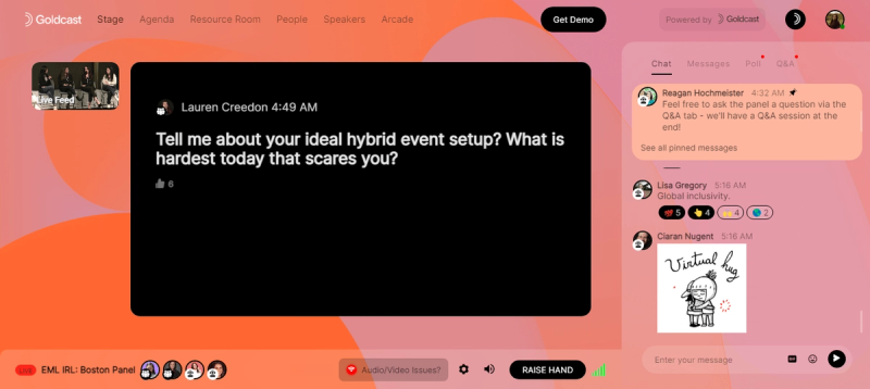 As the webinar progresses, you want the attendees to participate in the discussion. The webinar platform should have features that go beyond typical text chat. For example, Goldcast lets you engage the audience in the following ways: