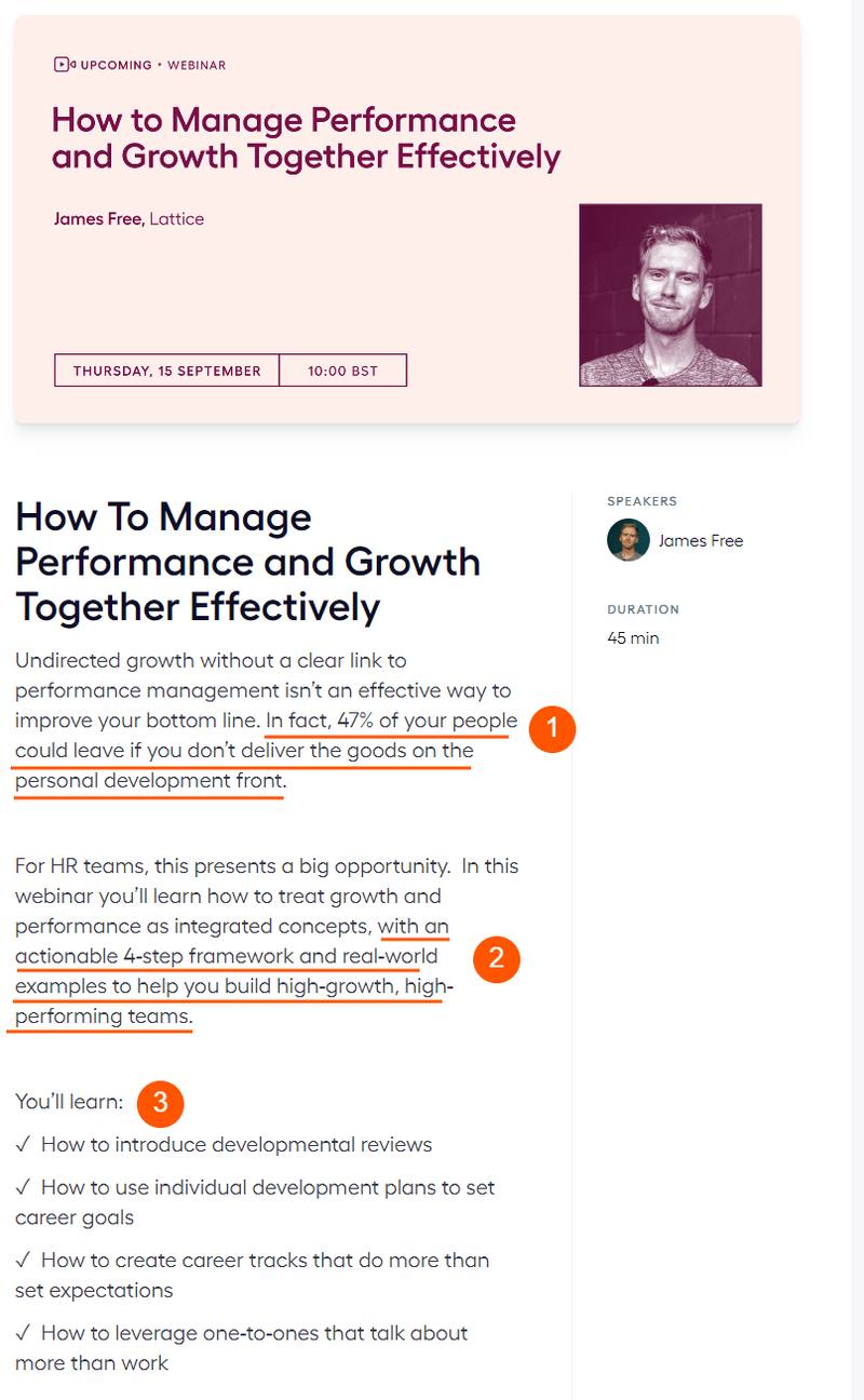 As you scroll through the page, the following elements help you quickly understand more context on the webinar and why you should care: