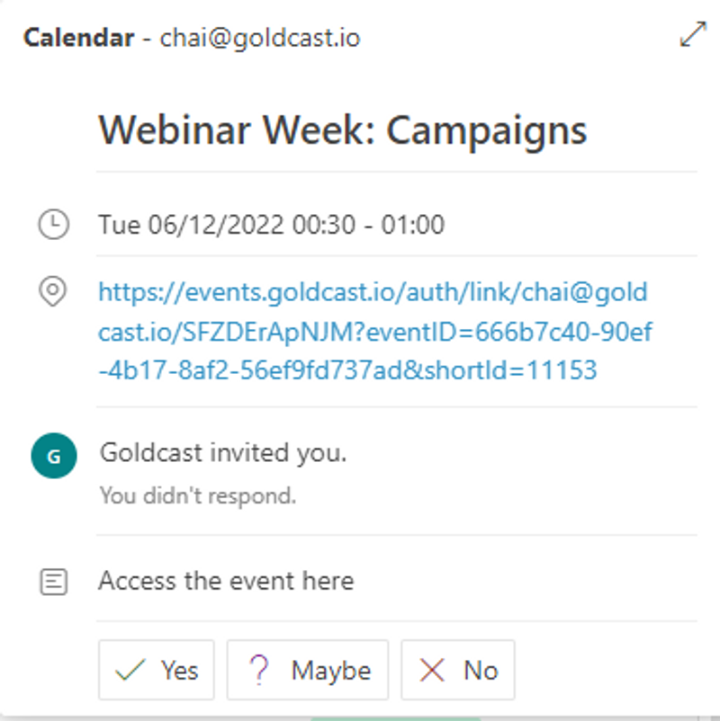 Automatic calendar holds are the best way to avoid this. With Goldcast, a placeholder is automatically added to a registrantās email as soon as they sign up. Thereās no extra step involvedāno need to log back into your email provider or accept an invite. Itās that easy!