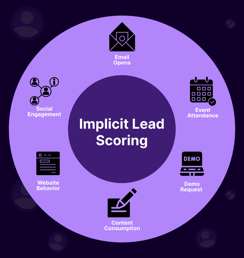 The implicit lead scoring model depends on a lead’s behavioral and engagement data. It tracks prospects’ online behavior, such as website visits, email engagement, event attendance, etc., and gauges their level of interest in your products.
