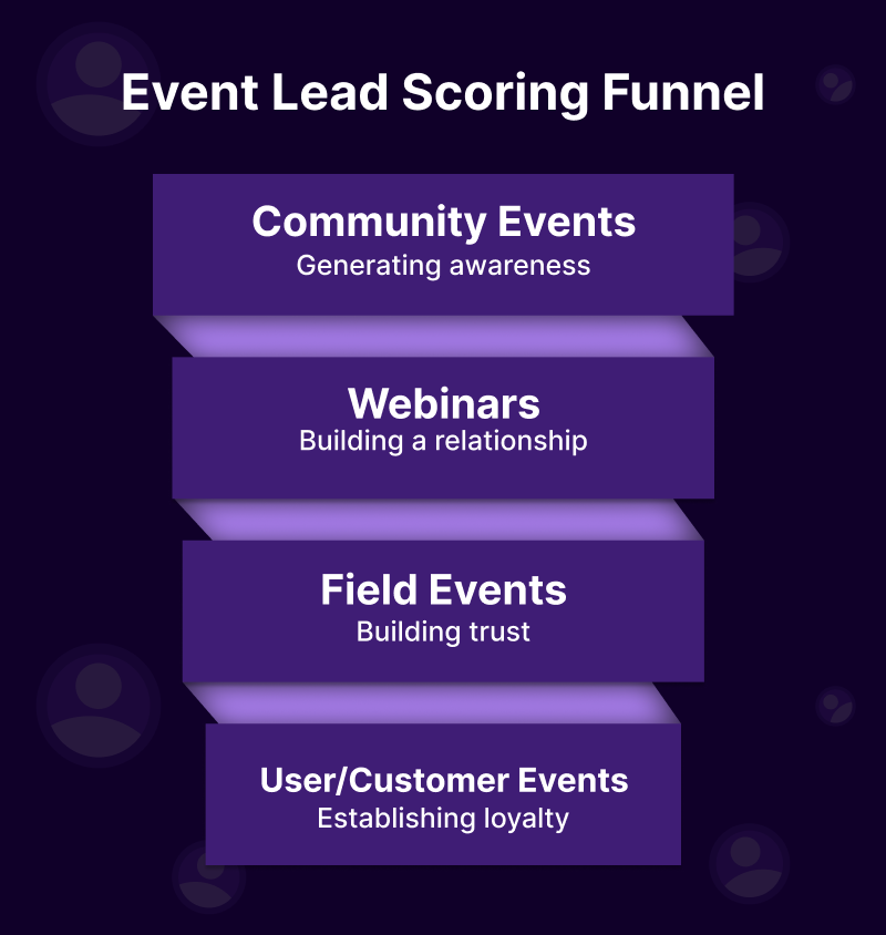 Community events, like attending an episode of Event Marketers Live, target a broad audience. We use these events to educate our audience and share thought leadership within the industry. The main goal of these events is to reach a relevant audience and introduce them to Goldcast. These attendees get the lowest score.
